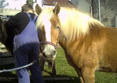 Das ist unsere Haflingerstute "Birke". Birke ist etwas dickköpfig, aber trotzdem sehr lieb und sehr neugierig. Streicheleinheiten und Leckerlis mag sie am Liebsten.