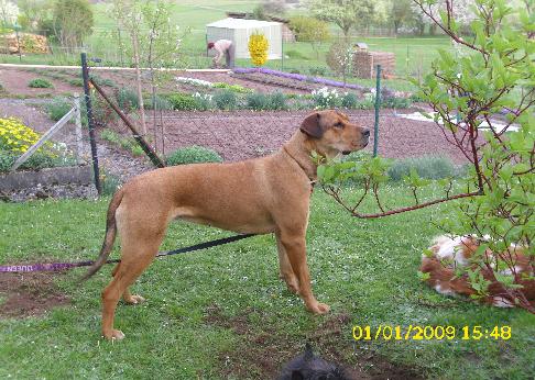 "Sheela" ist unsere "Kleine" sie ist drei Jahre alt und hat für einen Doggenmischling nur 70 cm Schulterhöhe, aber ich glaube sie ist sich ihrer Größe nicht bewußt, denn sie möchte einem immer auf den Arm springen um zu schmusen und zu spielen.